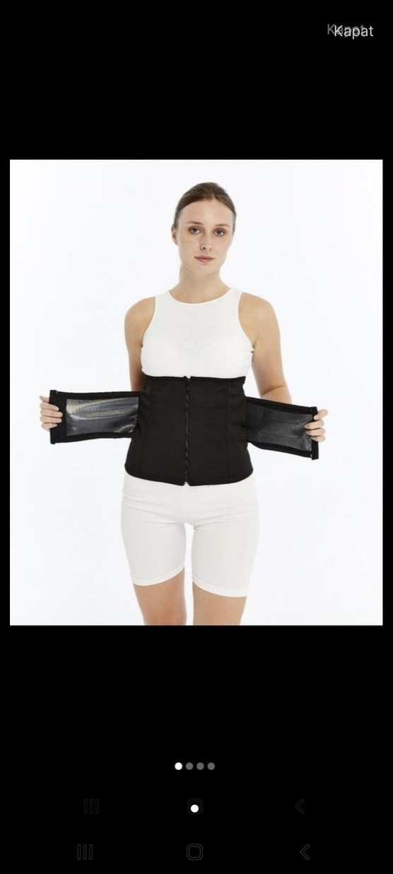 Siyah renkli, kısa boy, göbek kısmını saran ve önden kapanan ayarlanabilir yan bantlı sıkı korsedir.
