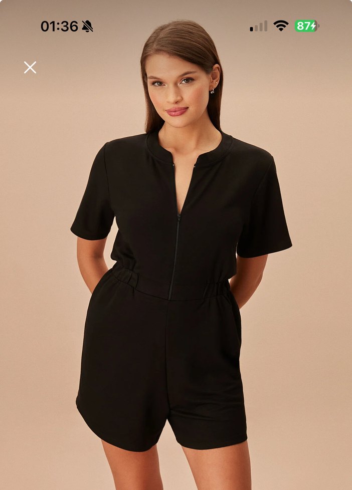 Siyah kısa kadın jumpsuit, V yaka ve kısa kolludur. Yumuşak süet kumaştan yapılmıştır. Günlük rahat kullanım için minimalist, desensiz ve düzenli kesimlidir. Sokak modasına uygun şık bir parça. ⏰