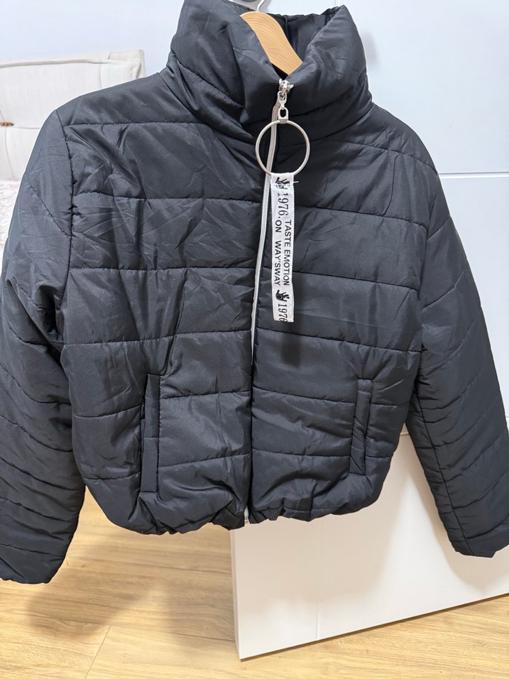 Yüksek yakalı, fermuarlı ve kısa kesim gri kışlık mont. Yumuşak fleece kumaştan yapılmış, günlük rahat kullanım için uygundur. Etiket üzerinde '1976.STEMO19' yazıyor. ❄️