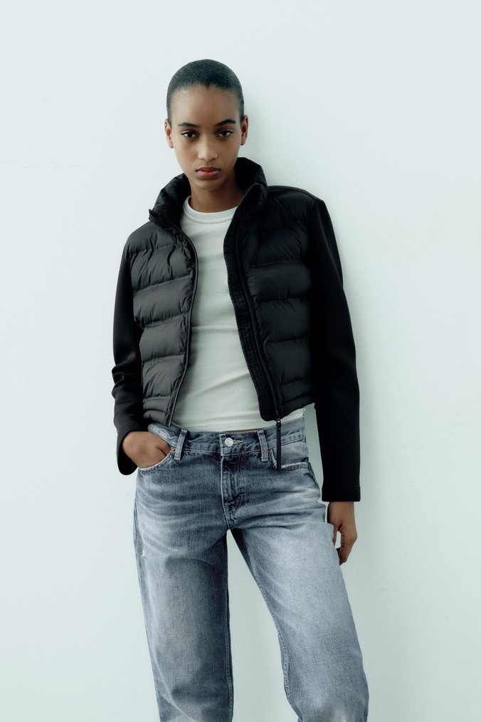 Siyah, kısa kesim kadın mont, ince kesim ve yüksek yakaya sahiptir.