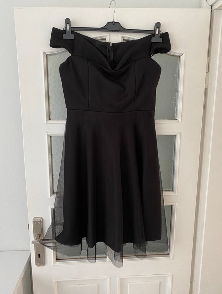 Siyah Kısa Arkası Fermuarlı Kayık Yaka Tüllü Abiye Elbise