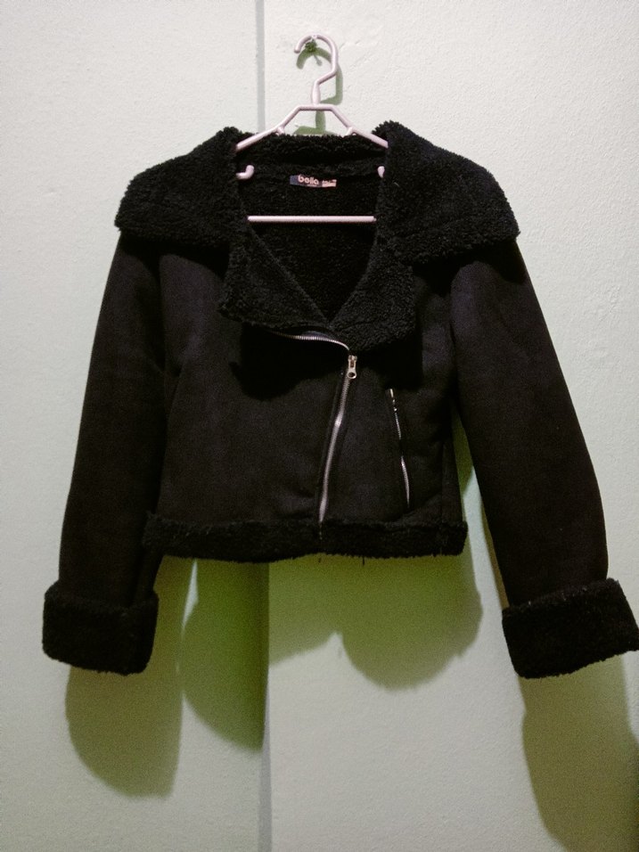 Siyah nubuk,kısa kesim, fermuarlı, yumuşak ve sıcak kumaştan kadın cekettir. Notlu yaka ve askılı kollara sahiptir, trend günlük tarz için uygundur.