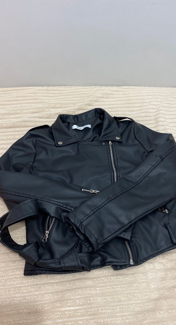 Siyah kısa kesim, fitted deri biker ceket. Notched lapel yakalı, fermuarlı ve kayış detaylı kolları ile sokak stiline uygun.