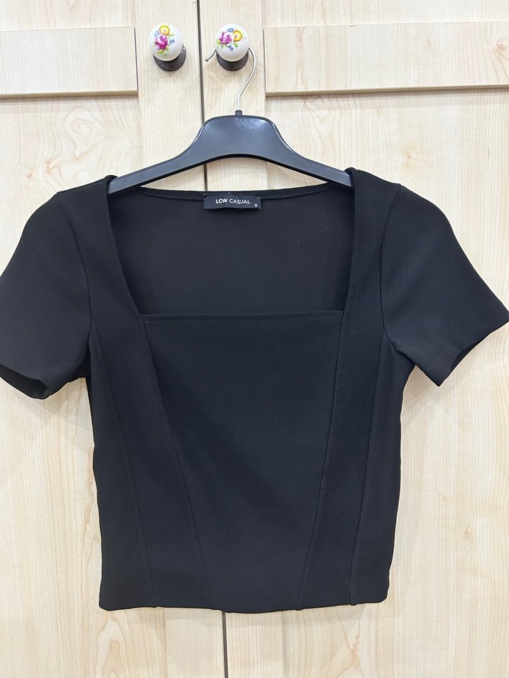 Düz siyah, kısa kollu, kare yakalı, vücuda oturan mini kadın bluz, yumuşak sentetik kumaştan üretilmiştir. ✨