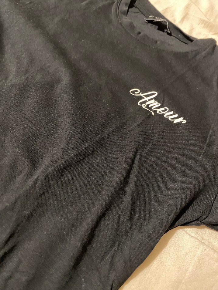 Siyah, pamuklu, kısa kollu ve bisiklet yaka Üzerinde 'Amour' baskısı detayları bulunur. Sokak stili için uygun.
