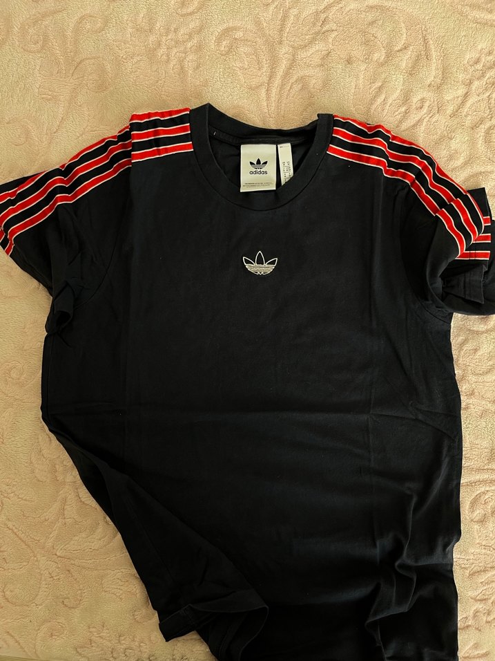 Orj Siyah, kısa kollu, dar kesim Adidas tişört, omuzlarda kırmızı-siyah çizgili detaylarla. Sentetik kumaş, spor ve rahat sokak stili sunar. ♂️