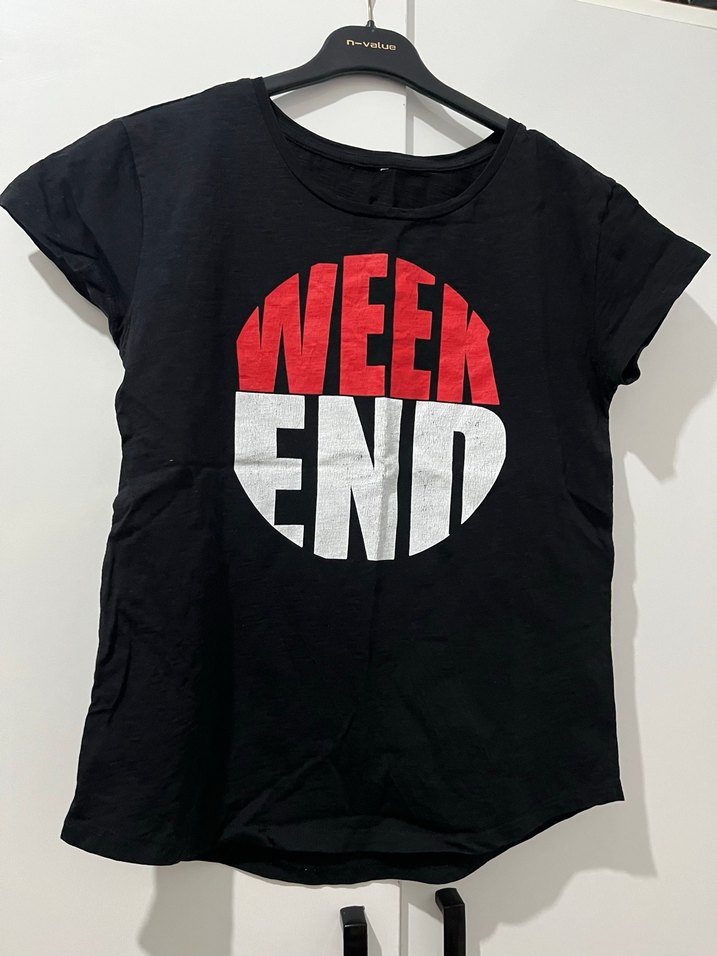Siyah pamuk tişört, kısa kollu ve yuvarlak yakalıdır. Bol kesim, WEEKEND" baskısı ile taşınır. rahat sokak stili için uygundur. S-M beden