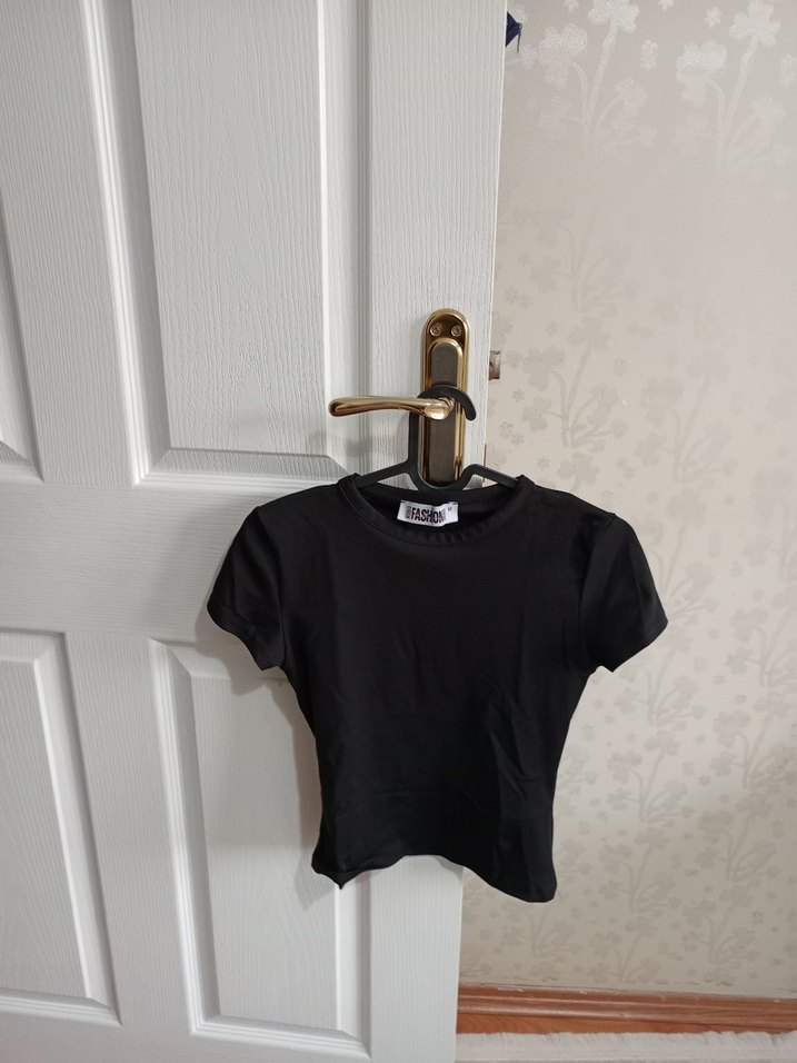 Kısa kollu, bisiklet yaka, siyah fitted crop top. Minimalist baskılı tasarıma sahip, günlük kullanıma uygun düz ve şık model.