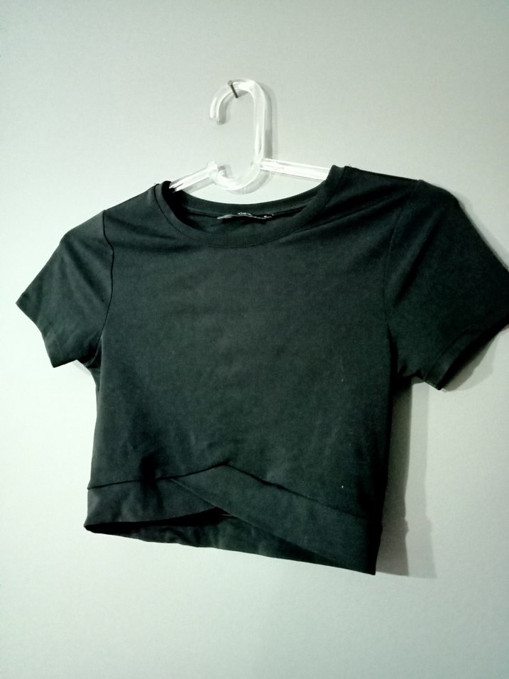 Siyah, kısa kollu, yuvarlak yakalı ve vücuda oturan kısa crop top. Yumuşak sentetik kumaştan yapılmış, günlük kullanım için uygun şık ve rahat bir model.