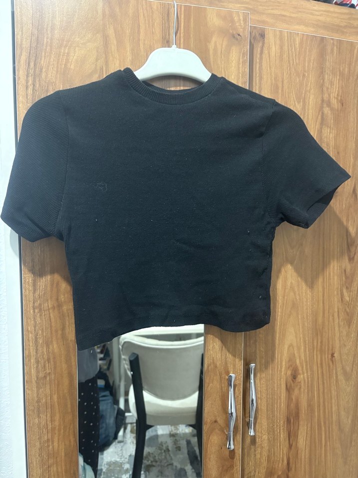Siyah renkli, kısa kollu ve yuvarlak yakalı crop top. Rahat sentetik kumaştan, sade ve düz tasarıma sahip, günlük kullanıma uygun.
