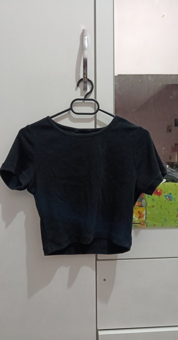 Siyah kısa kollu crop top, dar kesim ve yuvarlak yakaya sahip. Pürüzsüz sentetik kumaştan, minimalist ve rahat sokak stili için uygun.