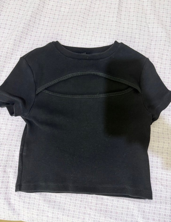 Siyah crop top, yuvarlak yaka ve kısa kollu, vücuda oturan kesime sahiptir. Minimalist sokak stili için yırtmaç detayı bulunur, dış mekan kullanımı için uygundur.