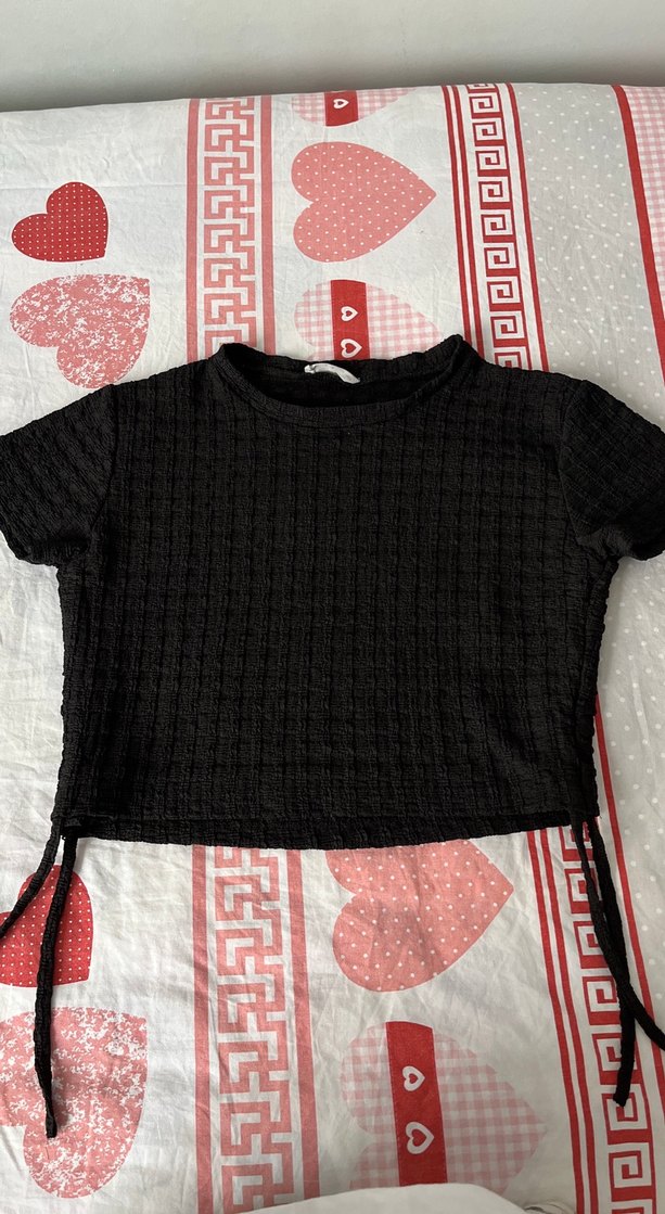 Siyah renkli, kısa kollu ve yuvarlak yakalı crop top. Yumuşak keten kumaştan örme dokusuyla rahat ve günlük kullanıma uygun.