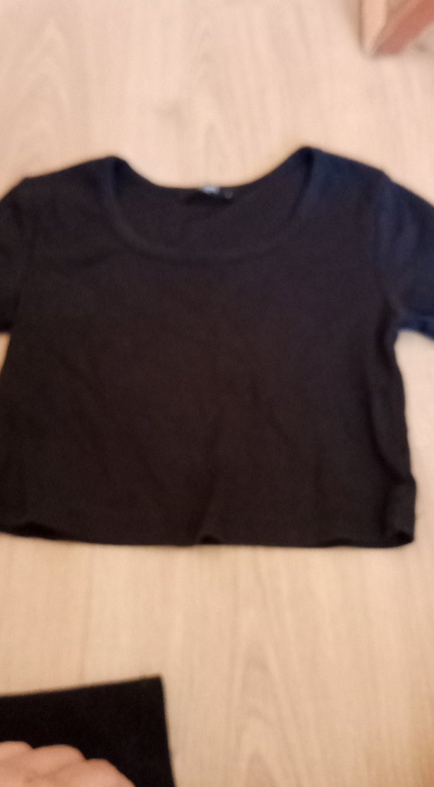 Siyah crop top, yuvarlak yaka ve kısa kollu. Vücuda oturan kesim, midi boyda, sentetik kumaştan. Minimalist gotik tarzda, günlük kullanım için uygun.