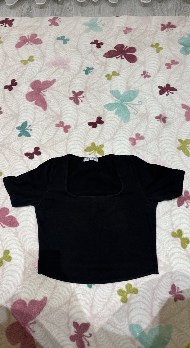 Siyah, kısa kollu ve tek renkli crop top, tekne yaka ve vücuda oturan kesime sahiptir. Minimalist tarzda, günlük sokak modasına uygundur.