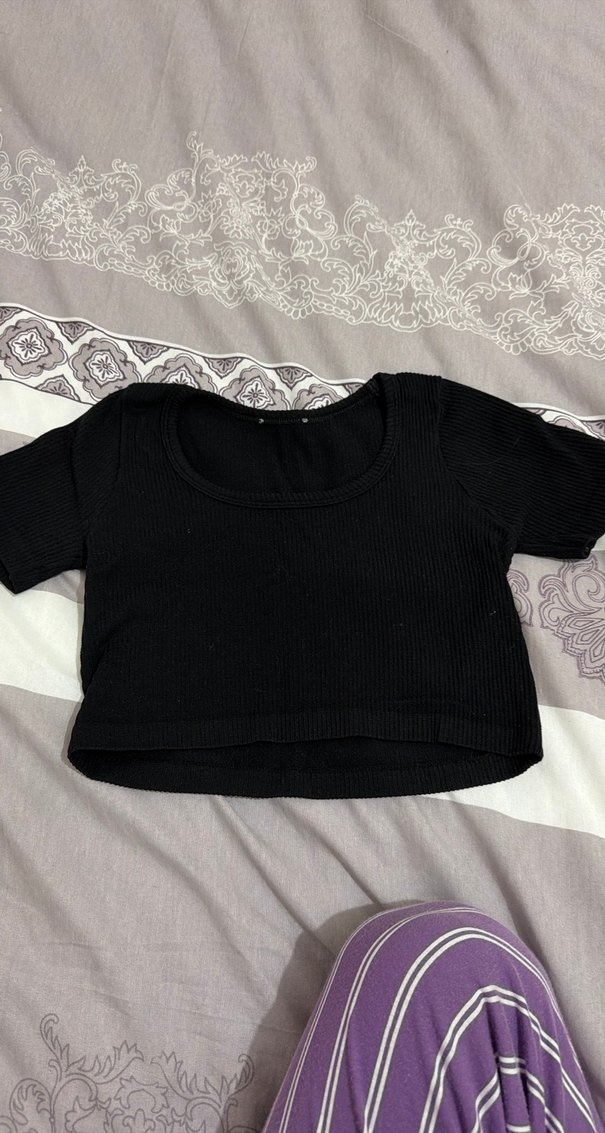 Siyah crop top, kısa kollu ve yuvarlak yakalıdır. Pamuklu yumuşak kumaştan, fitted kesim ve midi boydadır. Minimalist goth tarzında, günlük kullanım için şık ve rahat.