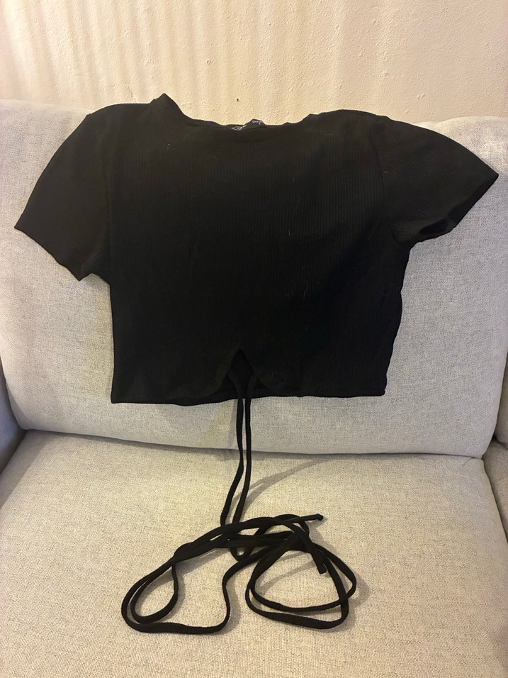 Siyah Kısa Kollu Crop Top Bağlama detaylı