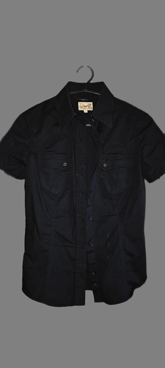 Siyah denim kumaştan, kısa kollu, yakalı ve düğmeli, günlük kullanıma uygun dar kesim gömlek.