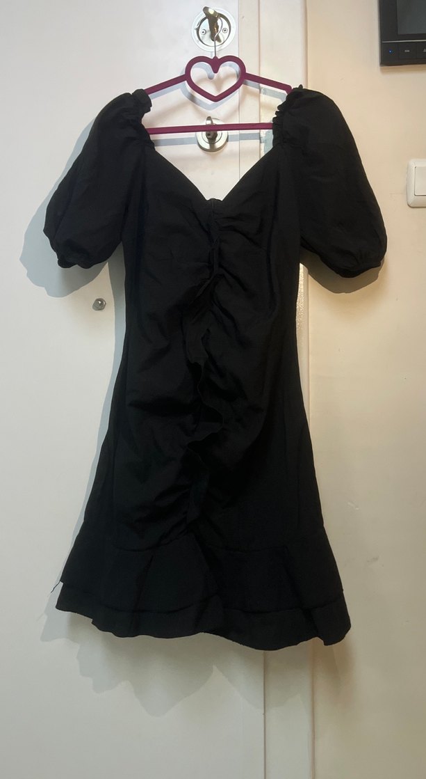 Kısa kollu, V yakalı ve drapeli detaylara sahip siyah mini elbise. Keten kumaştan balon kollu. Sadece 1 kere giyildi. Beden 38