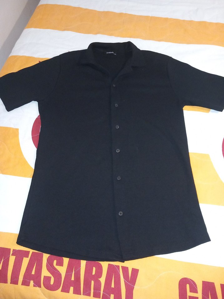 Siyah, kısa kollu, düğmeli erkek gömleği. Yakalı ve normal boyda, slim fit kesimdir. waffl dokuma kumaştan üretilmiştir. koltuk altından göğüs ölçüsü 52 cm boy 72 cm bel 47 cm 1 sefer giyildi.yenidir
