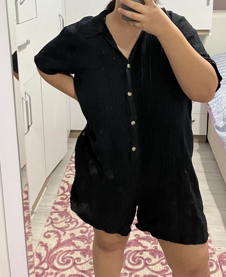 Siyah Kısa Kollu Düğmeli Keten Tulum