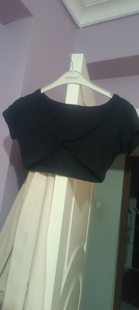 Siyah, düğmeli, kısa kollu kız bolero. Dar kesim ve yuvarlak yaka, sentetik kumaştan üretilmiştir.