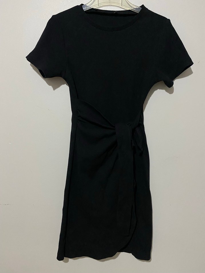 Kısa kollu, bisiklet yaka ve beli drapeli siyah elbise. Sentetik kumaştan yapılmış, minimalist goth tarzına uygun günlük kullanıma elverişlidir.