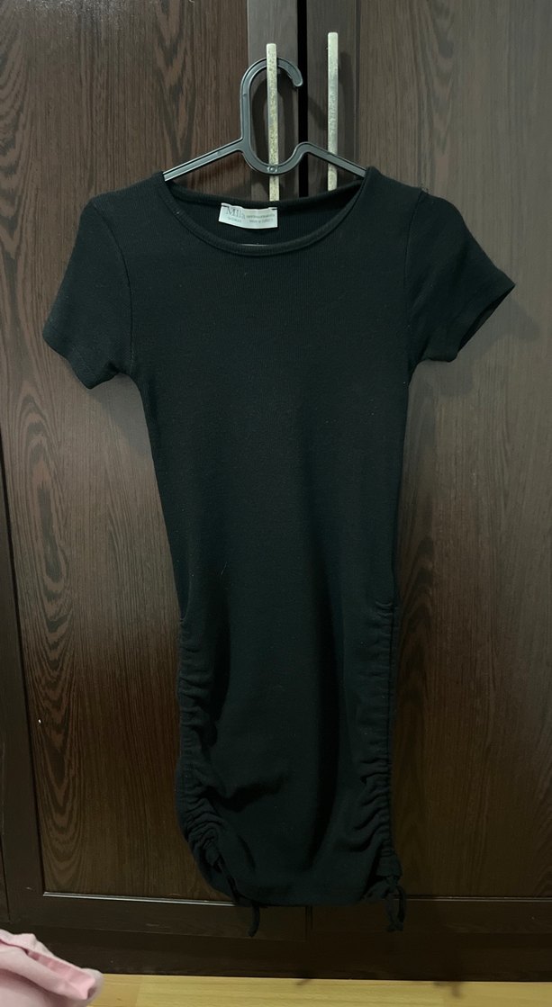 Bu siyah hamile elbisesi, kısa kollu ve yuvarlak yakalıdır. Düz, sentetik kumaştan üretilmiş olup, günlük kullanım için sade ve şık bir tercihtir.