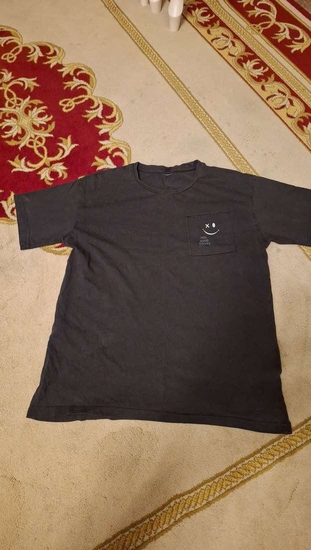 Kısa kollu, siyah erkek çocuk tişörtü, göğüs cebinde küçük baskılı detay ile. Hiçbir defosu yoktur.