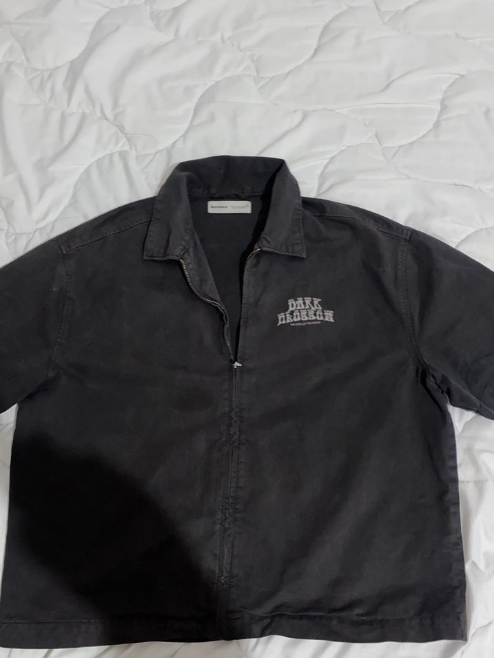 Keten kumaştan, düğmeli ve baskılı desenli siyah erkek gömleği. Kısa kollu, normal boyda ve salaş kesimdir, günlük kullanım için uygundur.