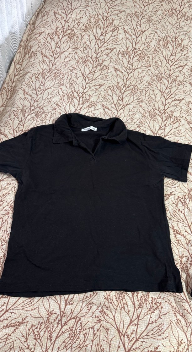 Erkekler için siyah, kısa kollu, yakalı polo tişört. Rahat kesim, yumuşak keten kumaş ve minimal desen içerir. Günlük şıklık için ideal.