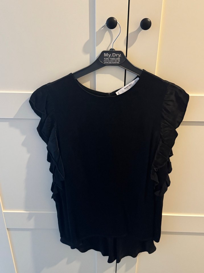 Siyah renkli, kısa kollu ve fırfır detaylı bluz. Yuvarlak yakalı, bol kesim ve ipeksi dokulu, günlük kullanıma uygun Paris sokak stili tarzında.