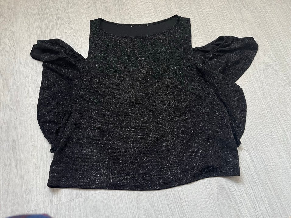 Siyah kısa kollu, kayık yaka ve fırfır detaylı bluz. Sentetik kumaştan, bol kesim ve kısa boyda, romantik gece için uygun.
