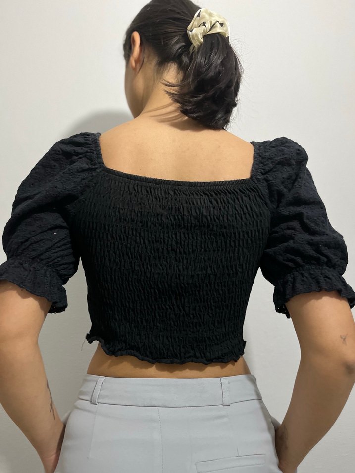 Siyah renkli, kısa kollu ve fit kesim kadın bluz. Kare yakalı, dokulu kumaşlı ve crop uzunlukta, günlük rahat kullanım için uygundur. Holly Lolly den alınmıştır