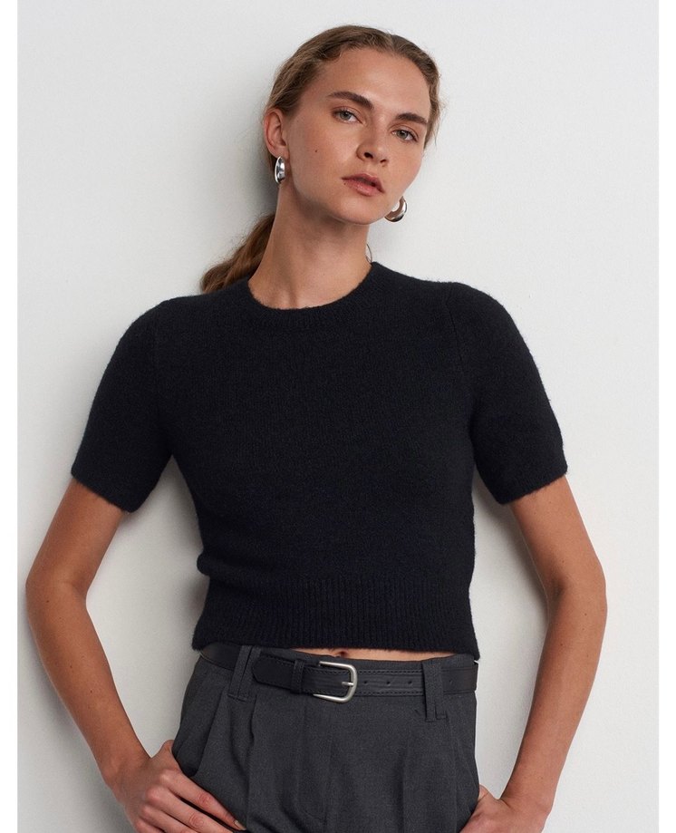 Yumuşak yünden, kısa kollu ve kısa boylu, düz siyah renkli, bisiklet yakalı, fit kesim kadın kazak.