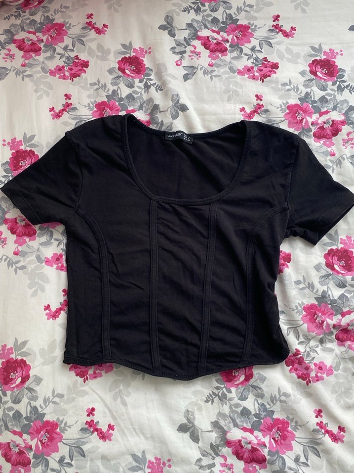 Siyah, kısa kollu ve tekne yaka, pileli detaylı gotik tarzda vücuda oturan crop top. Sentetik kumaştan, günlük kullanım için uygun.