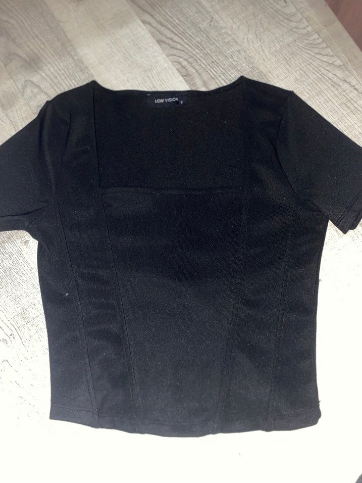 Kısa kollu, tek renk siyah crop top, tekne yaka ve vücuda oturan kesime sahip. Pürüzsüz sentetik kumaştan yapılmış, gotik tarz için uygun.