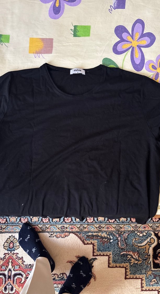 Siyah pamuklu, yuvarlak yakalı, kısa kollu ve bol kesim hamile tişörtü, günlük kullanım için rahat ve şık.