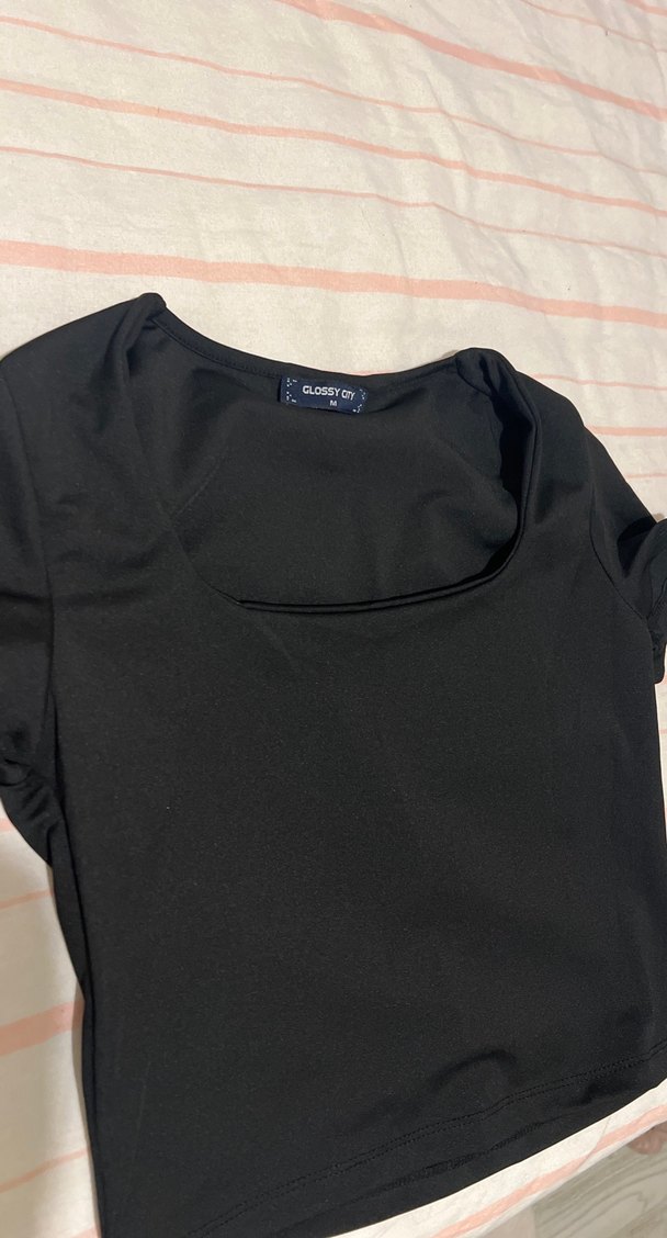 Düz siyah, kısa kollu, yuvarlak yakalı, hamile tişörtü. Rahat ve şık, sentetik kumaştan üretilmiştir.