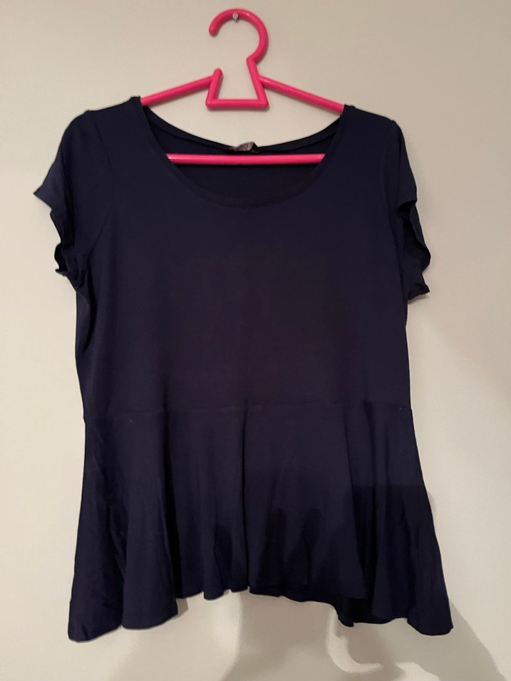 Siyah, yuvarlak yaka ve kısa kollu, volan detaylı hamile tişörtü. Rahat günlük kullanım için bol kesim ve normal boyda.