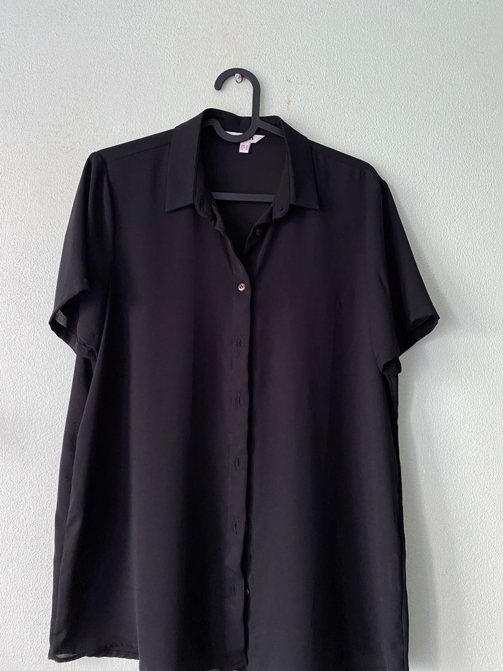 Siyah, düğmeli, kısa kollu, yakalı ve ince dokulu kumaştan yapılmış, normal midi boyda,gömlek. Ofis kullanımı için uygundur.
