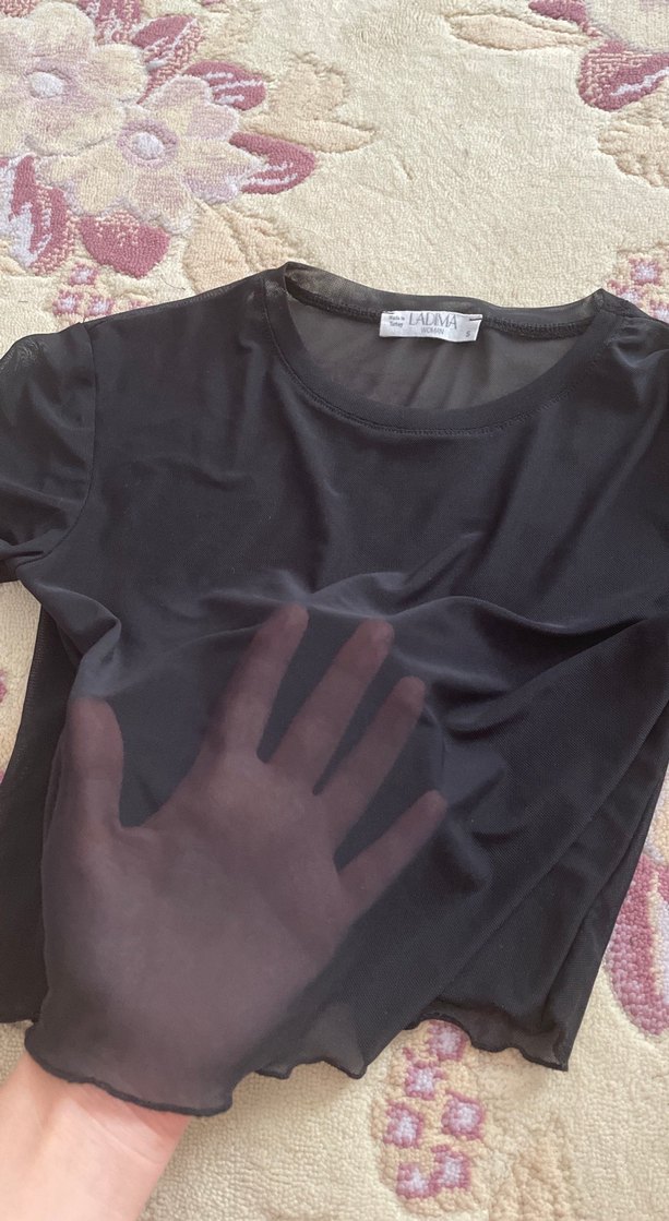 Siyah, kısa kollu ve ince kesimli kadın tişörtü. Düz, minimal ve goth tarzında, yumuşak sentetik kumaştan üretilmiştir.