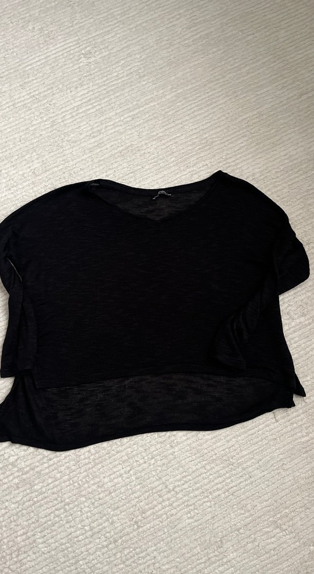 Siyah renkte, kısa kollu, yuvarlak yakalı, rahat kesim kadın bluz. Yumuşak keten kumaştan, minimalist gotik tarzda, günlük kullanıma uygun.