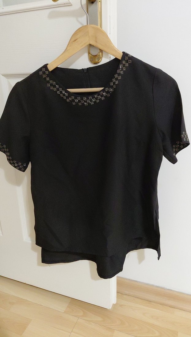 Siyah, kısa kollu ve yuvarlak yakalı bu bluz, hafif desenli detaylara sahiptir. İpeksi kumaştan, rahat kesim ve normal boyda, ofis için uygundur.
