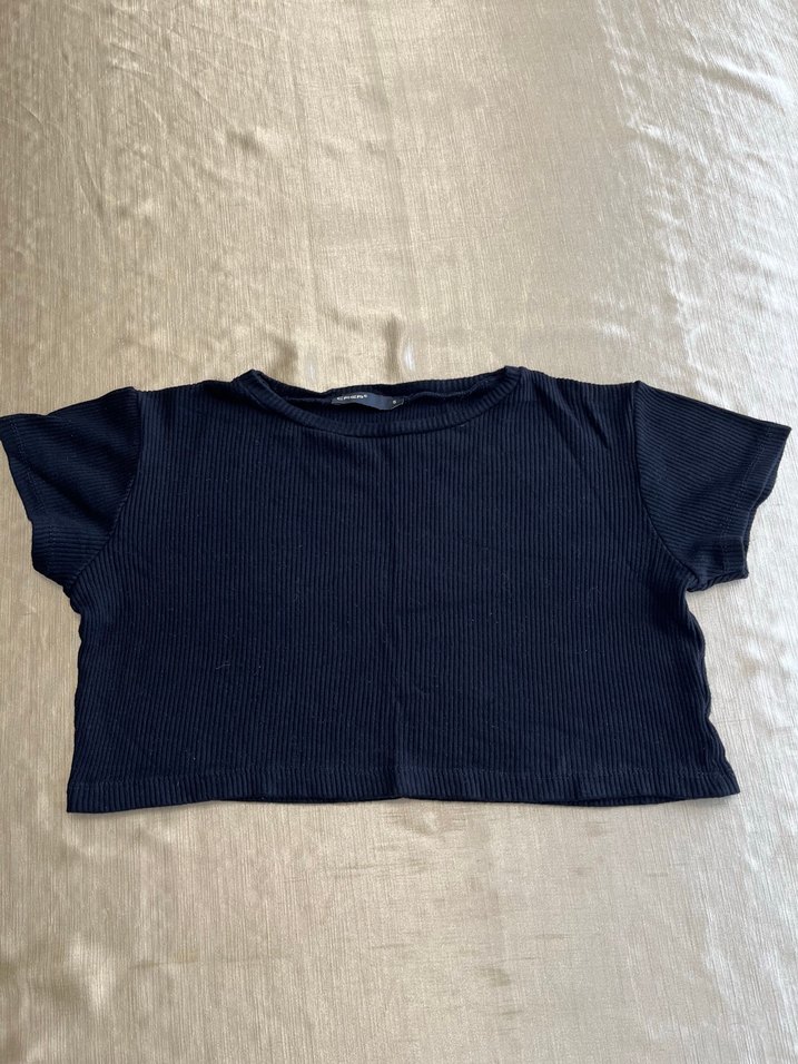 Kısa kollu, yuvarlak yaka, siyah crop top. Yumuşak keten kumaştan, minimal ve sokak stiline uygun, günlük kullanıma elverişli.