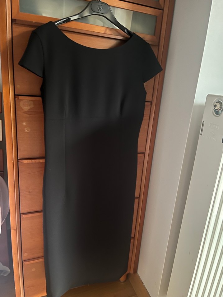 siyah kadın elbise, kayık yaka ve kısa kollu, İş ortamı için uygun, rahat kesim.#beymen