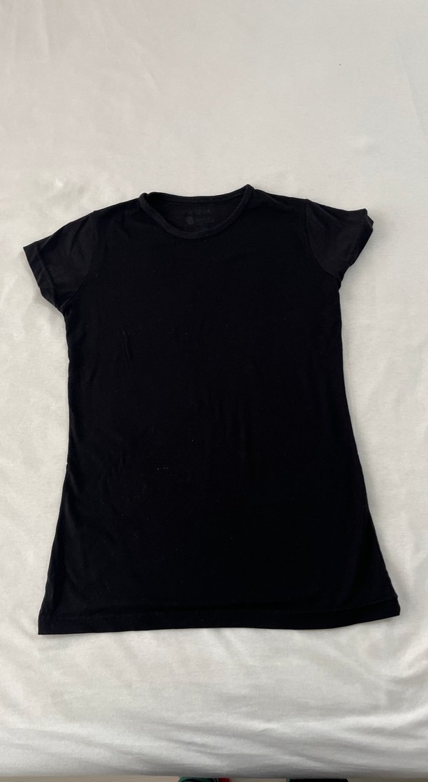Siyah, kısa kollu, yuvarlak yakalı, vücuda oturan kadın tişörtü, günlük kullanım için yumuşak sentetik kumaştan üretilmiştir.