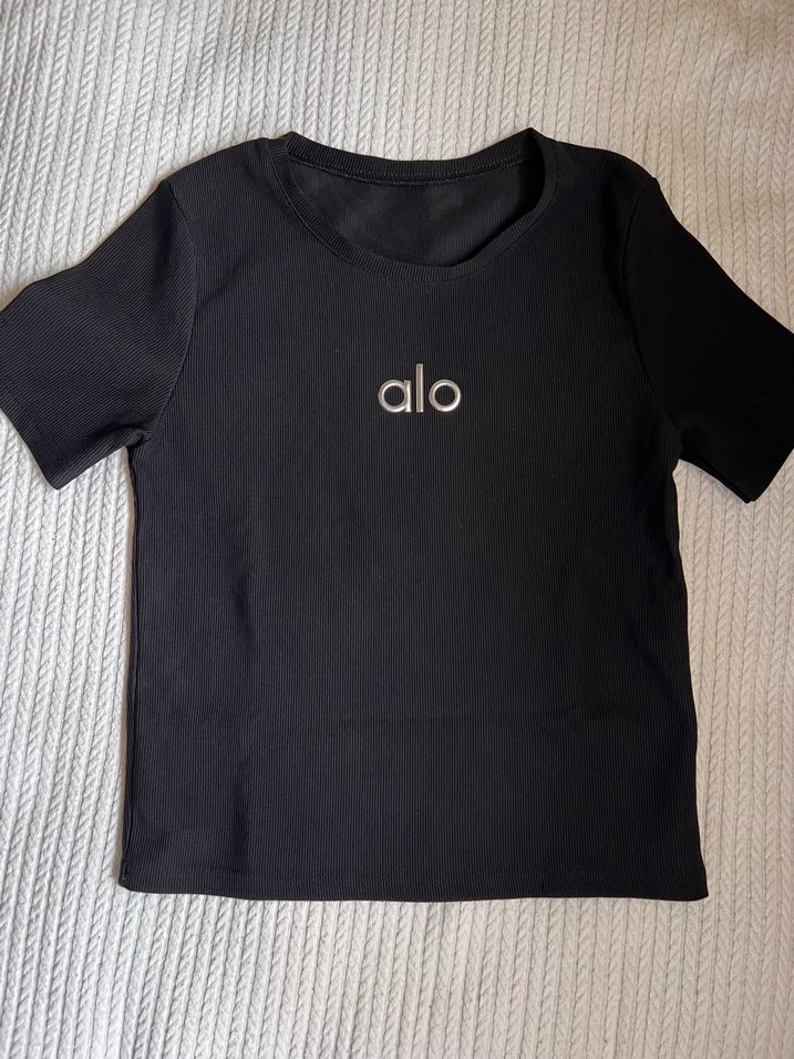 Pamuklu, kısa kollu ve bisiklet yakalı siyah tişört, önünde 'alo' baskısı bulunan sade ve şık bir parça.