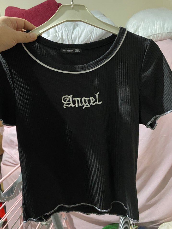Siyah, kısa kollu, dar kesim kadın tişörtü. Üzerinde 'Angel' yazısı ve pileli dokusu bulunur. Normal boyda, sentetik yumuşak kumaştan yapılmıştır.
