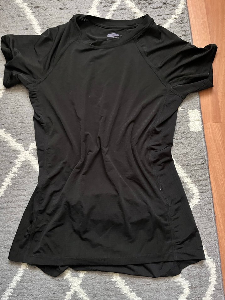 Siyah, kısa kollu, ince kesim kadın tişörtü. Sporcu tişörtü vücuda oturan model bedeni bana büyük geliyor o yüzden satışta s beden ama m bedene de olur defosu yok hiç giyilmedi